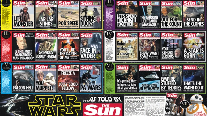 The Sun is a daily tabloid published in the UK known for its sensational and sometimes punny headlines. If you need a way to brush up on the previous six Star Wars before The Force Awakens comes out, they've got you covered. These pun-tastic front pages are probably the most painless way to relive the prequels, and will remind you just how glorious your favorite Star Wars moments truly were. Make sure not to miss the "free items" some covers offer in the top, right corner.