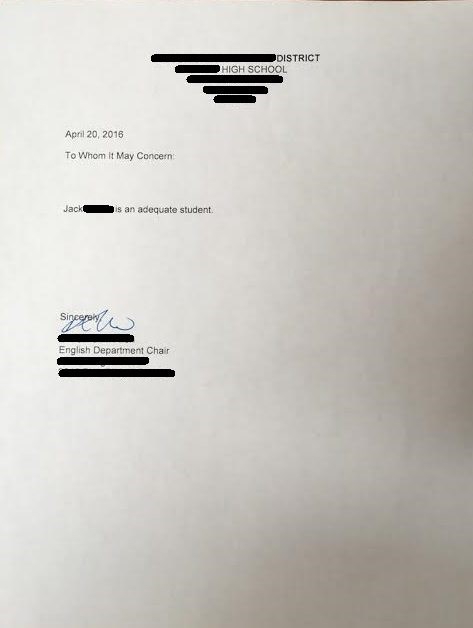 When Reddit user yakmo asked his teacher for a letter of recommendation this is what she gave him. Don't worry though, according to him, "We get along very well, this was a joke from her. She gave me a real one a few minutes after."