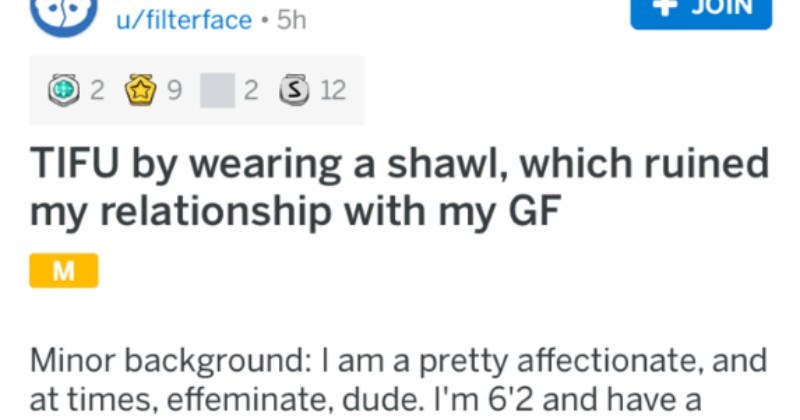 This guy found himself in quite the silly conundrum after wearing a "cursed shawl" alongside his shawl bro. Sounds like it sent his girlfriend into a bit of a tailspin, and she proceeded to aggressively question him on his sexuality. At a certain point, it just became clear that things weren't destined to be. Who knew a shawl could end up crushing a relationship with such swift precision.