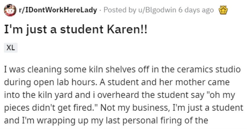 Karens have a really hard time mistaking other people for employees. This time around it was a pottery student who got trapped in the telescopic sights of a wild Karen who refused to believe that she was talking to a person who actually couldn't fulfill her demands.