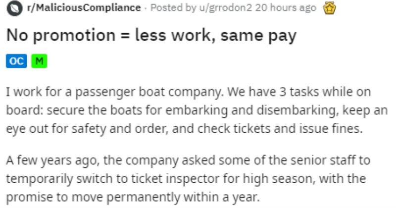 Imagine being denied a promotion because you're deemed unqualified for a job you already do. Sometimes, when work is unfair enough, overworked employees can revolt by literally just doing their job description. When people apply themselves they can become lords of efficiency, opting to work smarter and not harder.