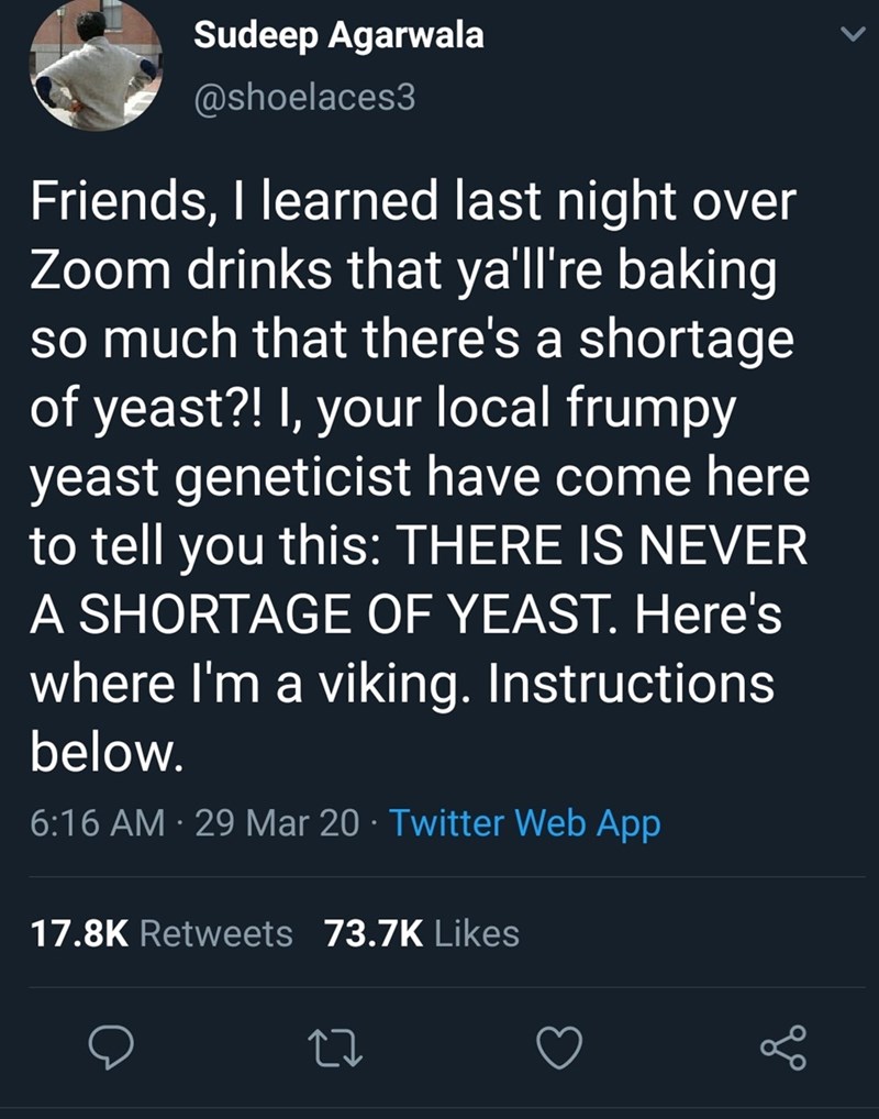 Local yeast geneticist, Sudeep Agarwala, picked up wind that people were encountering yeast shortages. So, like any awesome human being does, Agarwala decided to share a helpful and fun Twitter thread on how one goes about making homemade yeast.