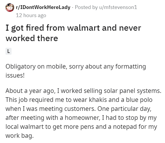 This random dude wearing a blue shirt had a run-in with a manager who was eager to fire someone she didn't even recognize. This one's kind of the opposite of this chef who was hired by a law firm just to foil the security guard. Employees of huge retail chains have to put up with some strange problems at work, like this guy who got hired and through a series of mistakes, never did anything but still stayed employed for months.