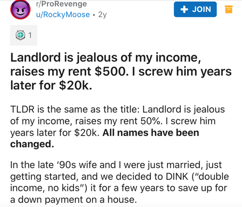 Text - r/ProRevenge u/RockyMoose • 2y + JOIN 1 Landlord is jealous of my income, raises my rent $500. I screw him years later for $20k. TLDR is the same as the title: Landlord is jealous of my income, raises my rent 50%. I screw him years later for $20k. All names have been changed. In the late '90s wife and I were just married, just getting started, and we decided to DINK ("double income, no kids") it for a few years to save up for a down payment on a house.