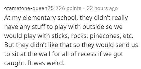 School justice is a minefield of extremely arbitrary, always changing no-tolerance policies where you're just as likely to get punished for something someone else did. You never forget a stupid reason for being punished. School is a jungle, and it can lead to what people describe as their school's incident, and can continue on to awkward moments at school reunions.