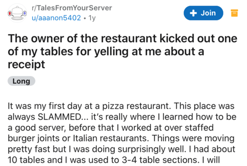 Definition of a power move. Sounds like this table was filled to the brim with toxic BS, and making a mess of an otherwise peaceful environment. When the owner of the restaurant found out the table was hassling his employee, he up and kicked them out. Basically, this sounds like the coolest boss ever. A true fairytale experience for anyone working in the industry, dealing with entitled customers who think they're right just cause they're customers.