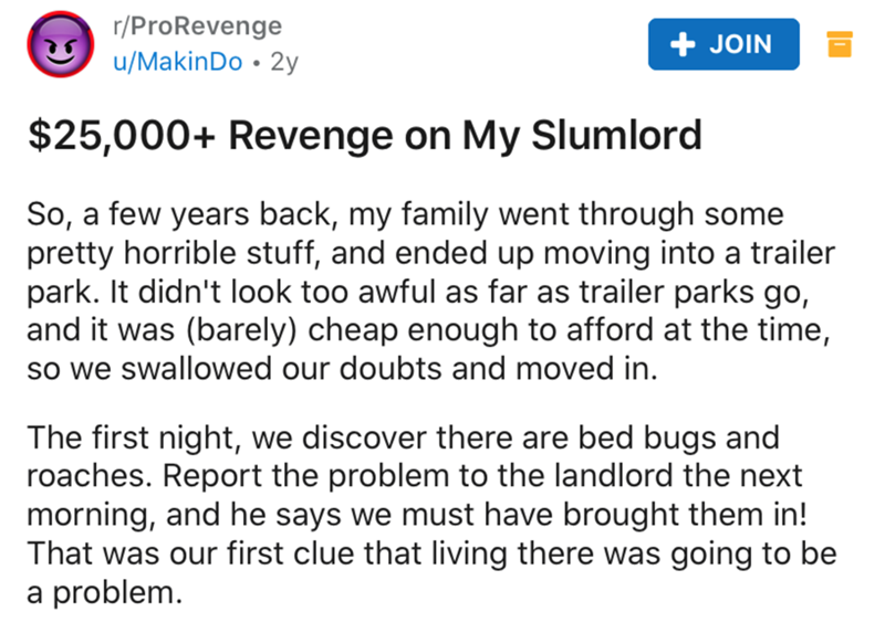 Text - r/ProRevenge + JOIN u/MakinDo • 2y $25,000+ Revenge on My Slumlord So, a few years back, my family went through some pretty horrible stuff, and ended up moving into a trailer park. It didn't look too awful as far as trailer parks go, and it was (barely) cheap enough to afford at the time, so we swallowed our doubts and moved in. The first night, we discover there are bed bugs and roaches. Report the problem to the landlord the next morning, and he says we must have brought them in! That w