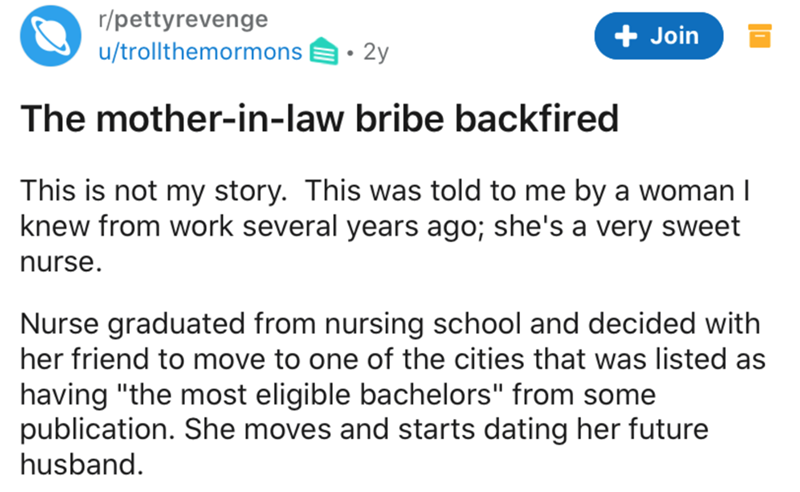 Man, this mother-in-law sounds like she was channeling the very worst of herself. She'd play nice when everyone was around, and soon as the room was cleared, she'd bombard the woman set to get married, with all kinds of toxic BS, and eventually even a bribe to leave. Well, the woman certainly played it cool. She gladly took the money offered, and figured she'd stick around thereafter. I love it.