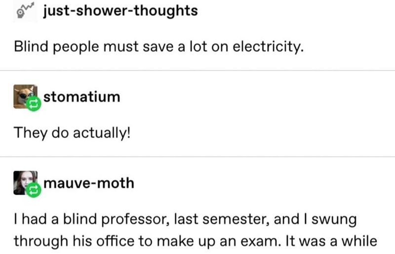 Text - just-shower-thoughts Blind people must save a lot on electricity. stomatium They do actually! mauve-moth I had a blind professor, last semester, and I swung through his office to make up an exam. It was a while