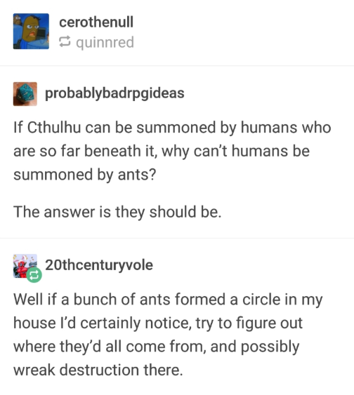 So it started with a goofy observation on ants getting your attention, and then someone gave it some more thought and re-characterized this whole thing as you taking on the God role in an ant war. A simple story prompt or small idea can spin into a whole thing, like this Tumblr thread about wildlife fighting off an alien invasion or this short story about lies making scars. For short bursts of creative weirdness here a bunch of Tumblr gems to keep the day moving.