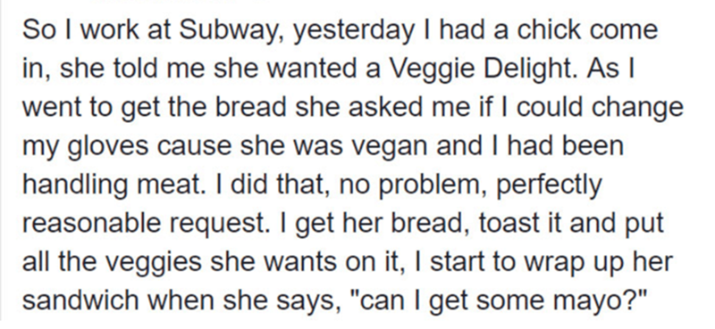 The Subway employee served up the knowledge free of charge. Love to picture the look of grim acceptance on the vegan's face when they learned that mayo was in fact not vegan. The fact they went through with the original sandwich order anyways is pretty great.