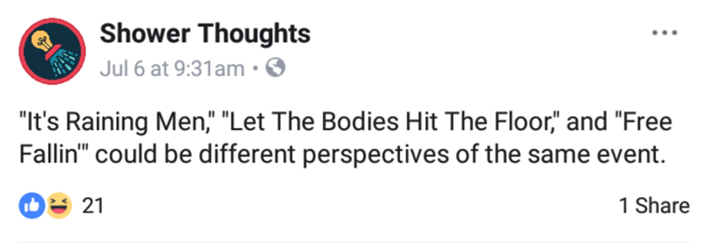 Nothing like a batch of shower thoughts to occupy the mind and fill the void. For whatever reason our brains churn out all kinds of nuggets of half-baked wisdom when we're in the shower. Whether it's the sobering realization that our tongues have the hardest job, and are constantly avoiding being chopped off; or something more innocent like the fact that taking crumbs away from an ant could make said ant look like a liar to the rest of the colony; shower thoughts are a swell time.