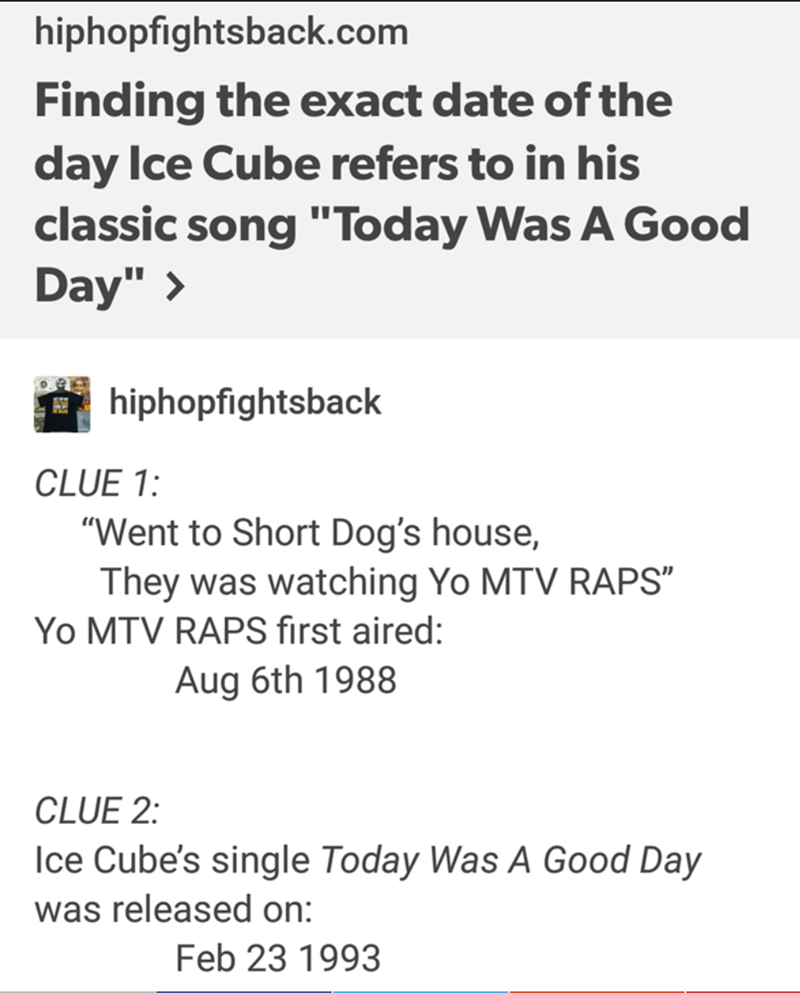 This is what the internet is for. A Tumblr user decided to crunch the numbers to figure out the exact date of Ice Cube's "Good Day."