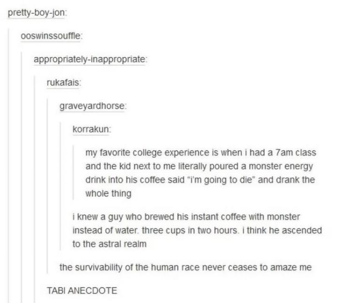Caffeine makes you more alert, and college students want to be more alert, so naturally they take the effects of caffeine to their limits. For more stories about people doing stupid things, here are people's high risk low reward moments. For more junk from Tumblr's trunk, here are various Tumblr Gems to keep the day moving.
