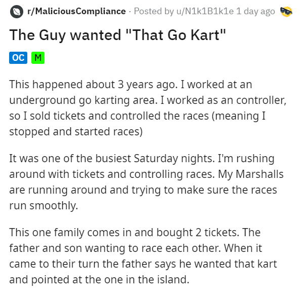Sometimes customers think they know what they want, and are so pigheaded that they refuse to listen to employees tell them crucial information like "the plate is hot" or "sir, you're eating plastic fruit." In this case it was a dad who demanded to use a go-kart with no engine in it. For some more customer service demands, here's one where a customer demanded to speak to a man until he ended up in the legal department.