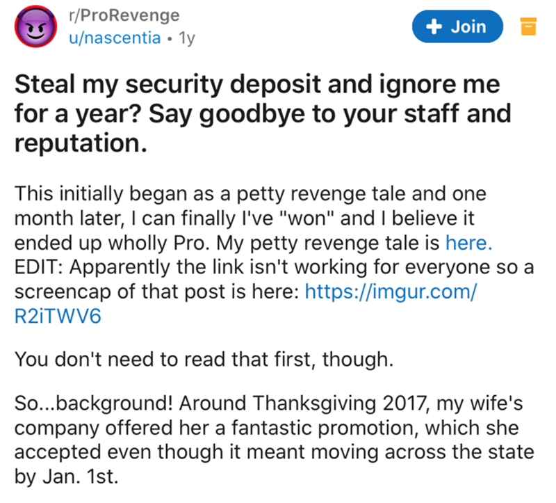 Text - r/ProRevenge u/nascentia • 1y + Join Steal my security deposit and ignore me for a year? Say goodbye to your staff and reputation. This initially began as a petty revenge tale and one month later, I can finally I've "won" and I believe it ended up wholly Pro. My petty revenge tale is here. EDIT: Apparently the link isn't working for everyone so a screencap of that post is here: https://imgur.com/ R2ITWV6 You don't need to read that first, though. So...background! Around Thanksgiving 2017,