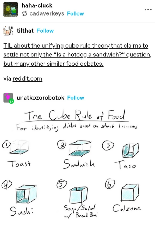If you subscribe to the belief that the shape of the starch component defines the dish, then a hot dog in a bun suddenly starts to enter taco territory. This radical form of classification is reminiscent of the whole "coconuts are mammals" Tumblr thread. For some more Tumblr gems, here's some Tumblr gold harvested from Tumblr's rabbit holes.
