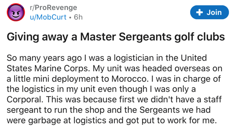 Text - r/ProRevenge u/MobCurt • 6h + Join Giving away a Master Sergeants golf clubs So many years ago I was a logistician in the United States Marine Corps. My unit was headed overseas on a little mini deployment to Morocco. I was in charge of the logistics in my unit even though I was only a Corporal. This was because first we didn't have a staff sergeant to run the shop and the Sergeants we had were garbage at logistics and got put to work for me.
