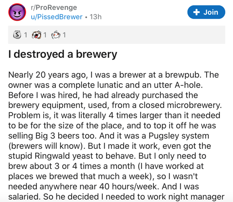This brewery owner is a prime example of one of those people who never should've been able to run his own business in the first place. The guy clearly had some gnarly knowledge gaps when it came to knowing the kind of stuff a brewery owner should, to run a successful business. I mean, the guy threw an Anniversary event and failed to advertise that the brewery made their own beers. That's some next level cluelessness. On top of being an oblivious owner, he participated in wage theft. Fortunately, our heroic brewer of the hour was ready to take his technical revenge. Don't screw over the guy who knows how to brew your company's beer.