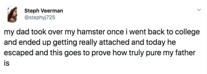 Poor dad lost his daughter's hamster for a hot second, and a complete and understandable breakdown ensued. Fortunately, everything works out in the end. You can really feel the love in dad's panicked texts.