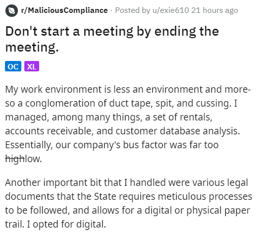 Text - Text - r/MaliciousCompliance · Posted by u/exie610 21 hours ago Don't start a meeting by ending the meeting. oc XL My work environment is less an environment and more- so a conglomeration of duct tape, spit, and cussing. I managed, among many things, a set of rentals, accounts receivable, and customer database analysis. Essentially, our company's bus factor was far too highlow. Another important bit that I handled were various legal documents that the State requires meticulous processes t