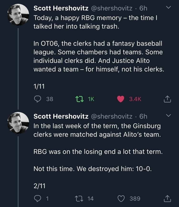 Following the passing of Ruth Bader Ginsberg, people were compelled to tell stories of the supreme court justice's impact and legacy. In this instance we have a guy sharing his time working with the justices in a fantasy baseball league. The thought of having a petty fantasy league moment in such an official setting is surreal.