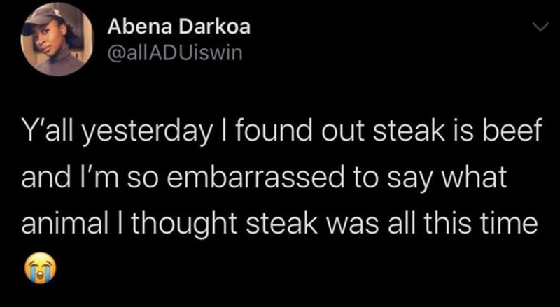 And just like that you learn something new every day. Whenever you get down and in the dumps coming off a fresh brain fart experience, just remember that there are in fact people walking this globe that are unaware that steak is beef. Unreal.