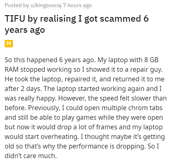 Computer trouble is a mystery to a lot of people, so it makes sense that it'd be easy to miss something. It's strange to look back and realize something you didn't know was going wrong, like these things people later discovered were illegal. For some funny scammer revenge, here's a scammer who got trolled with made up neighbor drama.