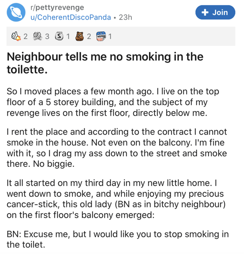 While we don't exactly have the fairytale ending because the cops showed up, it still must've been satisfying for this tenant to repeatedly prove to their whiny neighbor that they weren't actually smoking inside. That being said, it does sound like the old lady neighbor finally stopped bothering her neighbor about something that they were never doing in the first place. So, there's that nice silver lining.