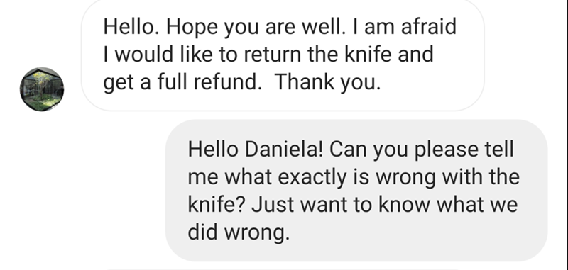 This choosing beggar really came out of left field when they up and tried to return a perfectly fine knife because the knife's "energy" was off. Well, not even off. They claimed it was a soulless shell. Come on. People don't have time to be dealing with this kind of nonsense. Check out some more juicy choosing beggar drama with this entitled parent who demanded a public artist make art for them.