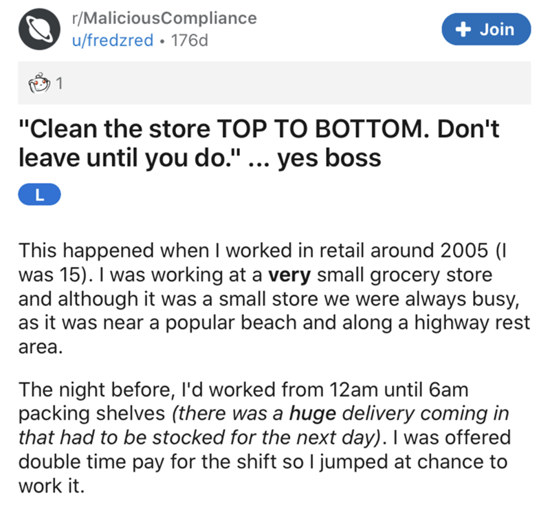 It's people like Fran that give the assistant managers of the world a bad rap. In this case, we see Fran express no level of sympathy and understanding for her absolutely exhausted employee who was fresh off an overnight shift. But alas, as will happen, the employee hit their breaking point, and decided to put into play some delightful malicious compliance. Fortunately, that malicious compliance ends up serving as the catalyst for getting Fran out of the business.