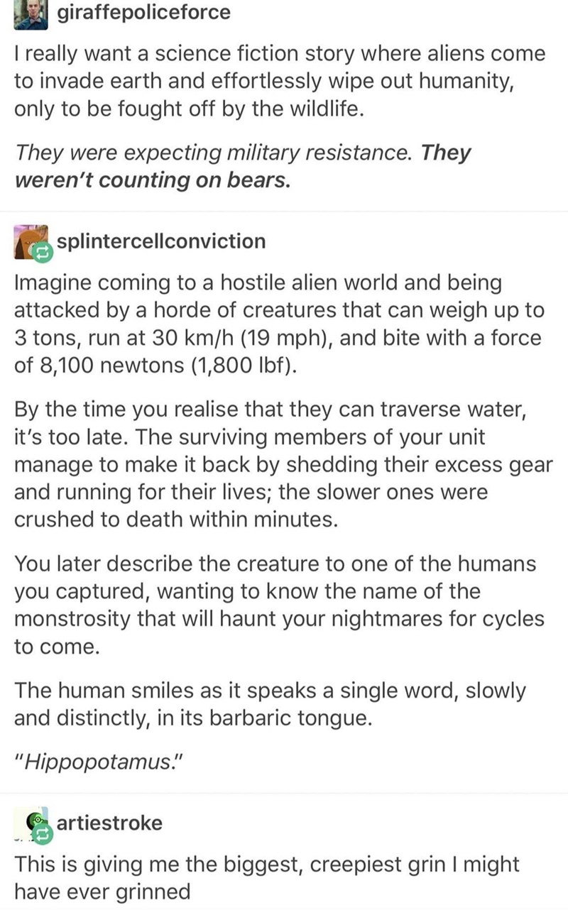 So basically, it's stories like the gem that we have with this one from Tumblr that prove that earth might seem easily conquerable, but there's an unanticipated punch waiting to be unleashed underneath the surface. Who knows? Maybe we already have alien homies hanging out in the ocean or something. There is apparently something like 90% of that big ol blue that has yet to be explored. Could be a whole party happening down there.