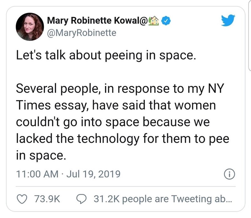 It's a lot easier said than done when it comes to taking a leak in outer space. I guess you'd expect nothing less. Everything seems to have an innate tendency to grow far more complicated as you drift further away from this particular rock that's flying through space. Mary Robinette Kowal provides an equally entertaining and informational Twitter thread on the backstory surrounding astronauts' experiences with trying to functionally use the restroom while on missions in outer space.