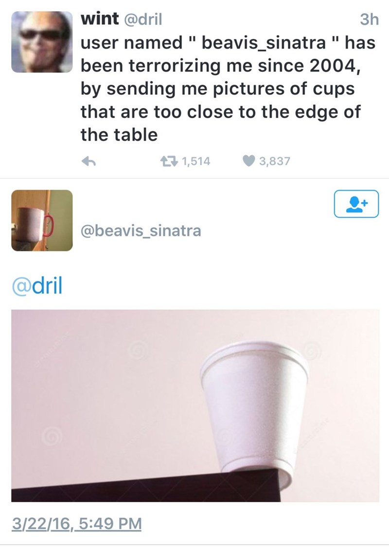 It's well known that the internet is weird. The flavor of that weirdness varies a lot. Do precariously balanced cups count as harassment? If you're the type of person whose blood boils looking at imperfect and frustrating things, then probably. Those cups man, why aren't they more on the table, man?