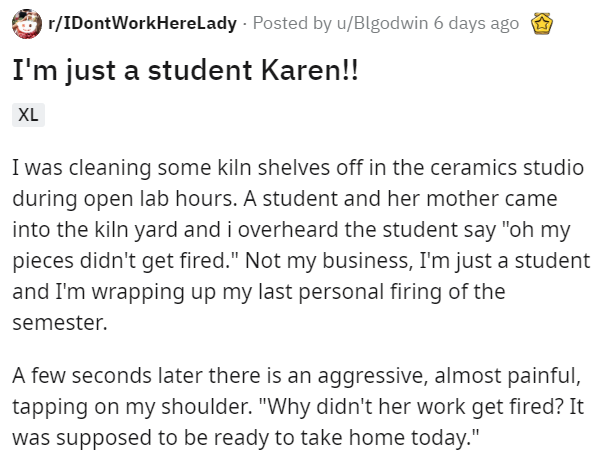 Karens have a really hard time mistaking other people for employees. This time around it was a pottery student who got trapped in the telescopic sights of a wild Karen who refused to believe that she was talking to a person who actually couldn't fulfill her demands.