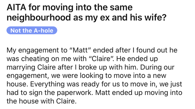 This woman asked the folks of Reddit whether or not she was in the wrong for moving to the same neighborhood as her ex and his wife. If anything it sounds like the guy in this situation isn't quite over his ex lover, and his current partner is well aware of it. With that being said though, it's really just always likely to err on the side of dramatics if you end up moving into the same neighborhood as your ex. Hard to picture a situation where something unfortunate doesn't end up happening.