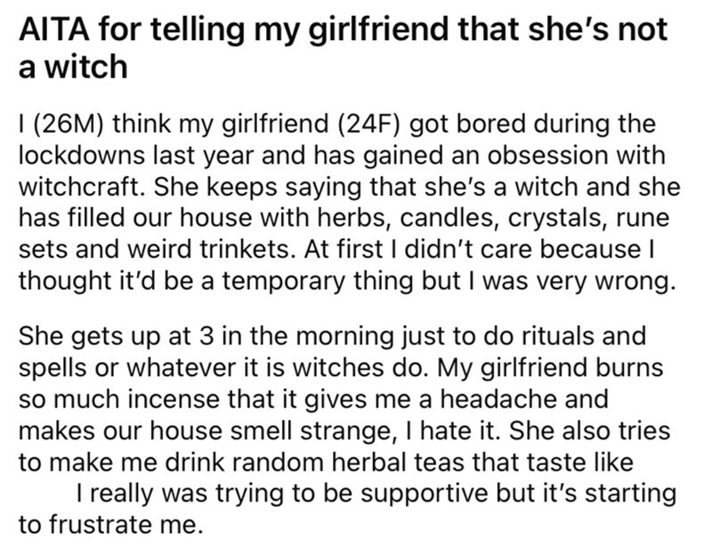 Just a little bit of trouble in paradise. This lad sounds as if he hit his breaking point amidst his girlfriend embracing her witchcraft. Basically, the dude is apparently carrying around a whole lot of bad energy, she addresses it, and he's totally not down with it. The thing is that his girlfriend expected the support. Was he in the wrong or not, for not offering that up? You be the judge.